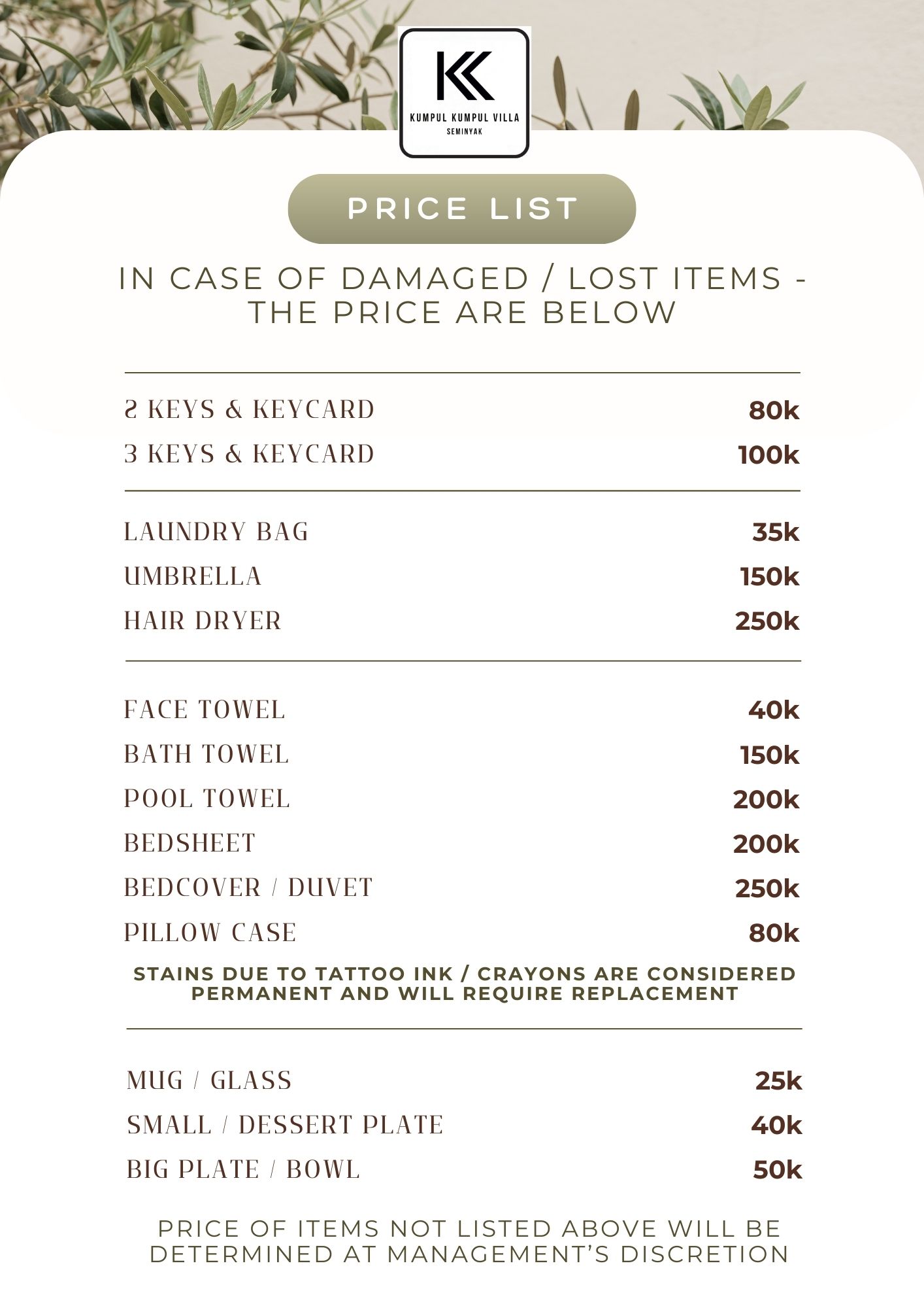 Guest is aware that safety box is provided to safekeep all valuables and currency. Guest accepts that Kumpul Kumpul Villa holds no liability and shall not be responsible for any loss or damage to the valuables or currency during the stay. Guest remain solely responsible for the safekeeping of the valuables and currency.